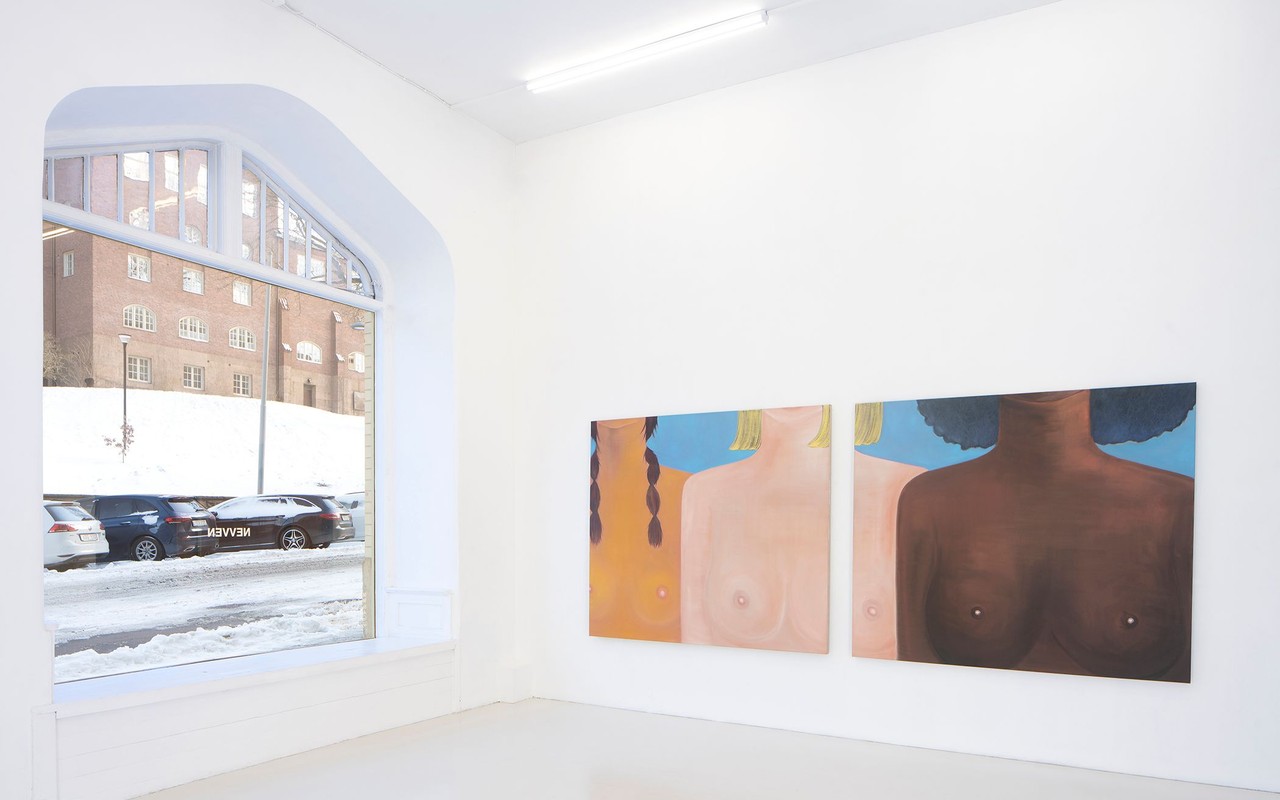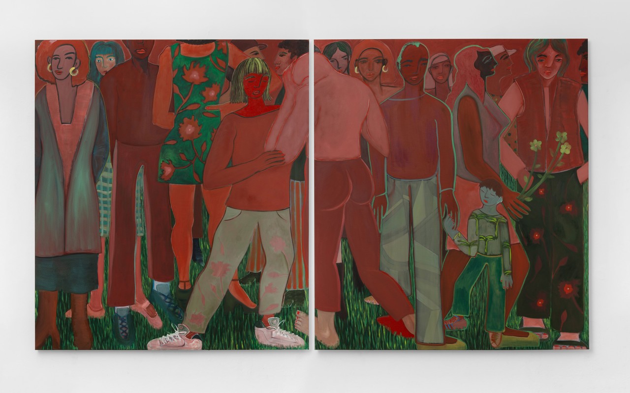 Kyvèli Zoi, Spectators, 2023, Oil on linen, diptych, dimensions variable, 140 x 160 cm each, installation view from Nevven Gallery, New York